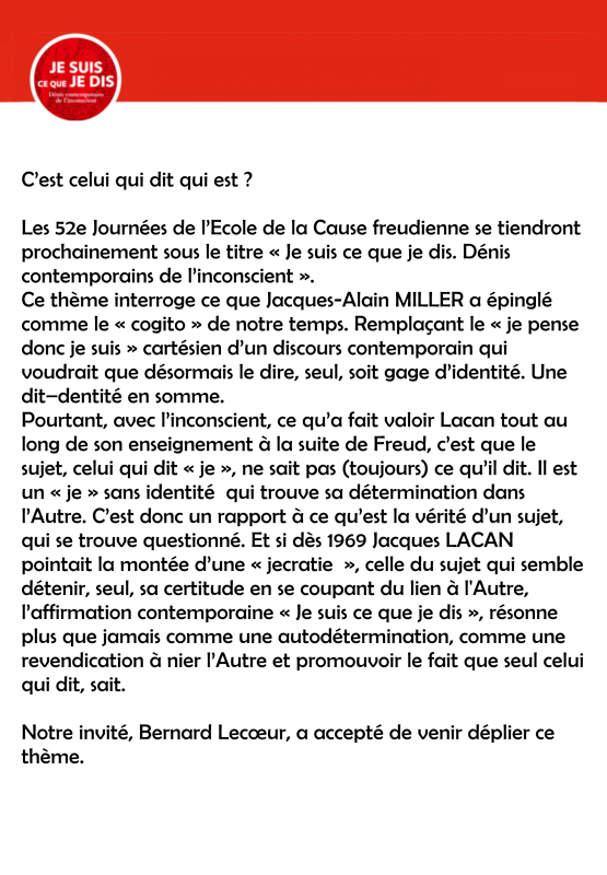 Les 52e Journées de l’Ecole de la Cause freudienne se tiendront prochainement sous le titre « Je suis ce que je dis. Dénis contemporains de l’inconscient ». Ce thème interroge ce que Jacques-Alain MILLER a épinglé comme le « cogito » de notre temps. Remplaçant le « je pense donc je suis » cartésien d’un discours contemporain qui voudrait que désormais le dire, seul, soit gage d’identité. Une dit–dentité en somme.