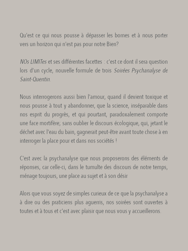 NOs LIMITes et ses différentes facettes : c'est ce dont il sera question lors d’un cycle, nouvelle formule de trois Soirées Psychanalyse de Saint-Quentin.