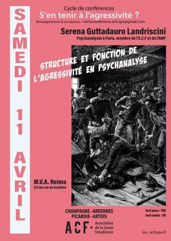 La psychanalyse d'orientation lacanienne, loin de chercher à reinstaurer des idéaux passéistes, ne nie pas cette agressivité au coeur de l'humain, mais invite à une position autre, éthique. Dans un cycle de trois conférences, nos invitées viendront partager leur travail sur cette question. Serena Guttadauro posera pour nous les jalons du concept de l'agressivité en psychanalyse et sa place dans l'expérience analytique. Puis Isadora Escossia abordera la question plus spécifique du crime et du passage à l'acte. Enfin, Caroline Leduc nous proposera sa lecture de ce qui se manifeste aujourd'hui autour des conflits et de la guerre.